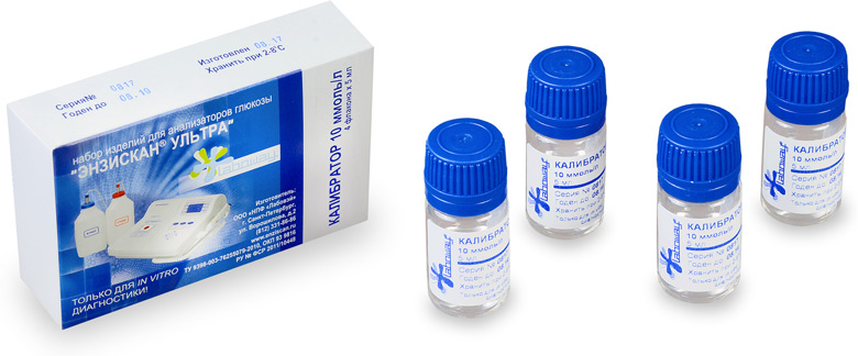 Калибратор 10 ммоль/л предназначен для калибровки анализатора. Поставляется в пластиковой упаковке. В уп. - 4 шт. стеклянных флакона с калибровочным раствором глюкозы. Срок годности - 2 года. Хранить при температуре 2-8 °С.